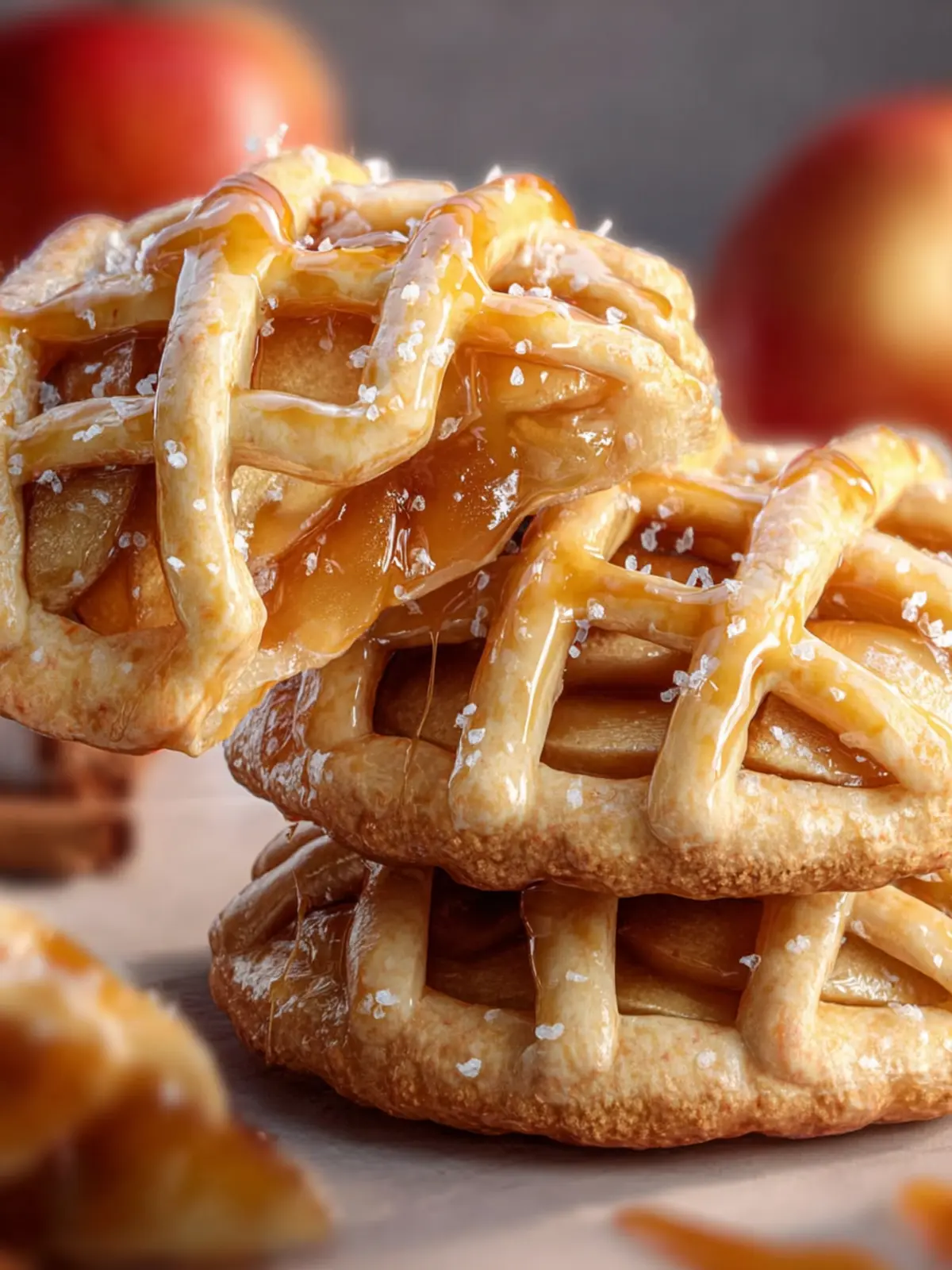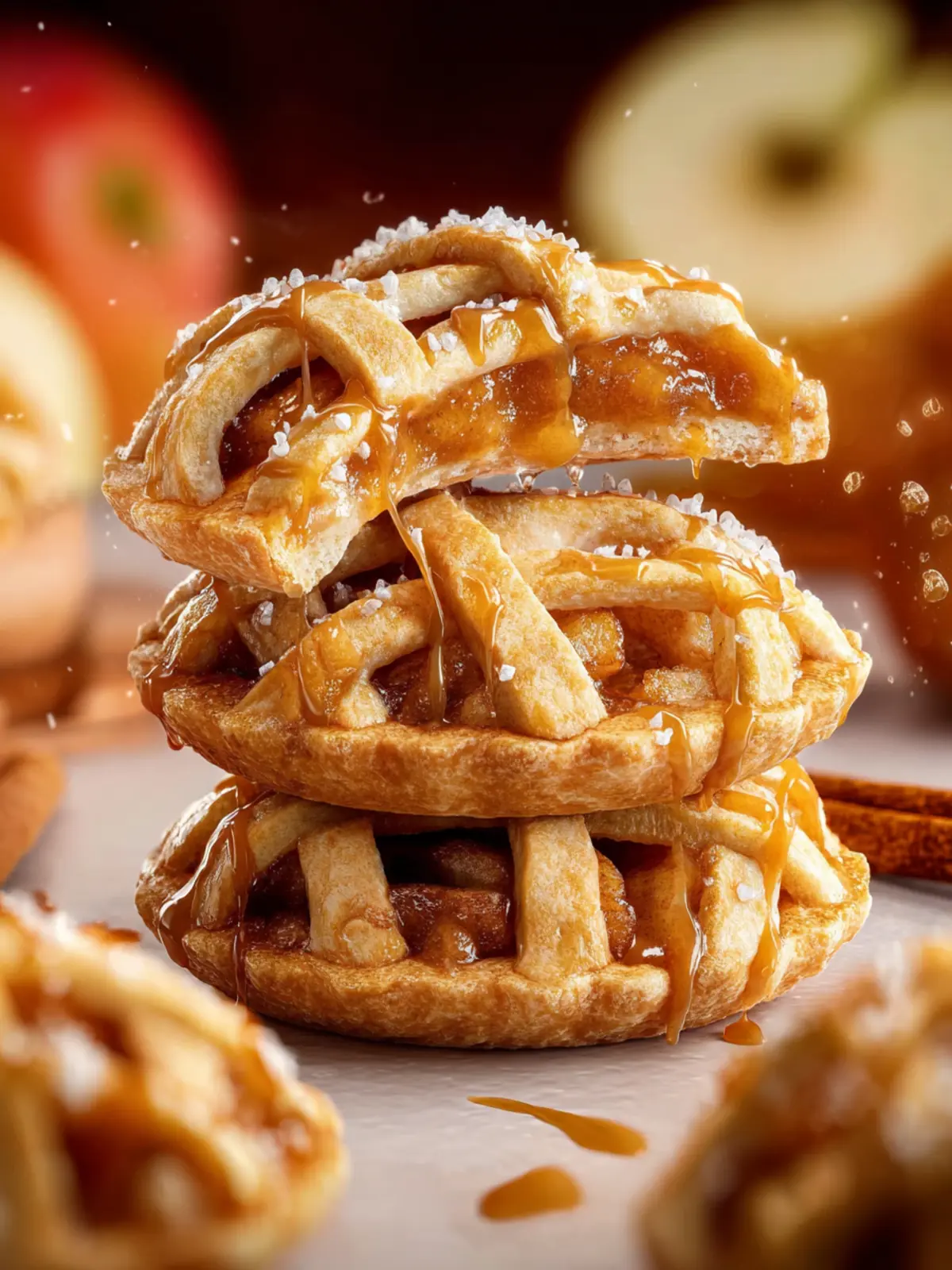 Delicious mini apple pie cookies topped with a caramel drizzle and sparkling sugar.