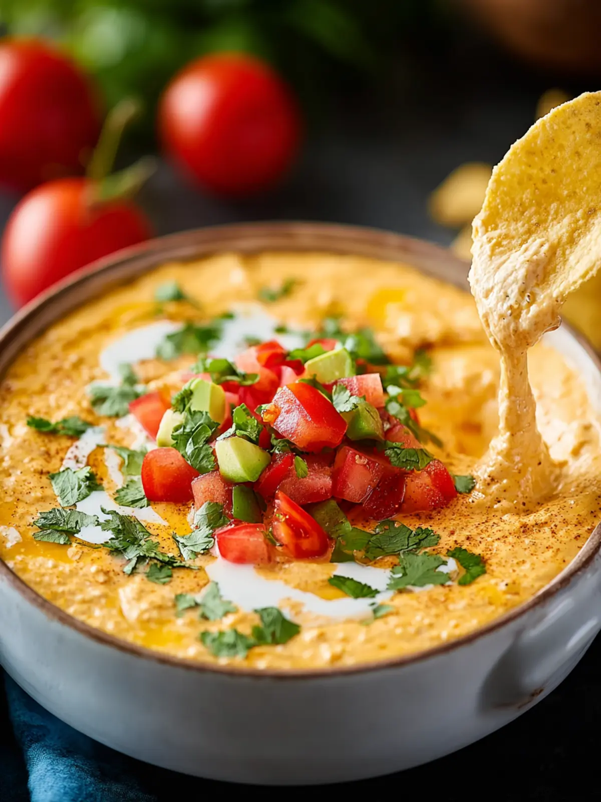 • Chips and Vegetables: Serve your dip with a variety of tortilla chips or fresh vegetable sticks like carrots, cucumbers, or bell peppers. The crunchiness contrasts beautifully with the smooth queso.