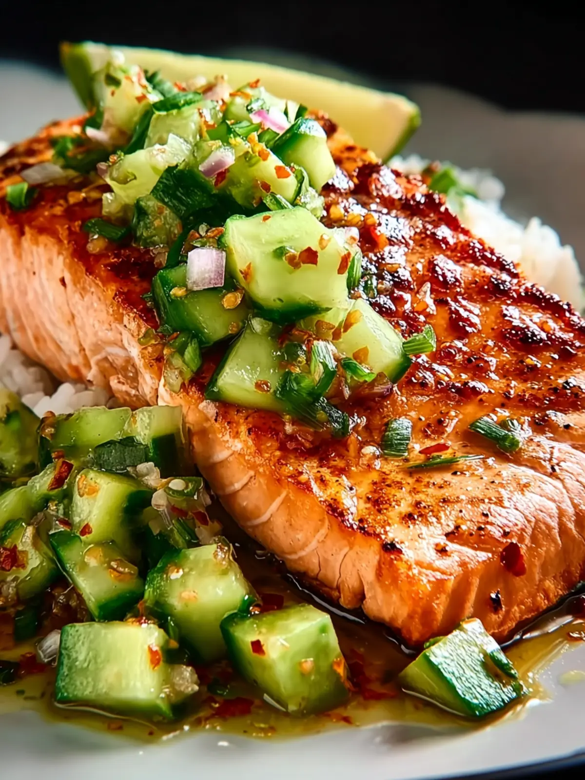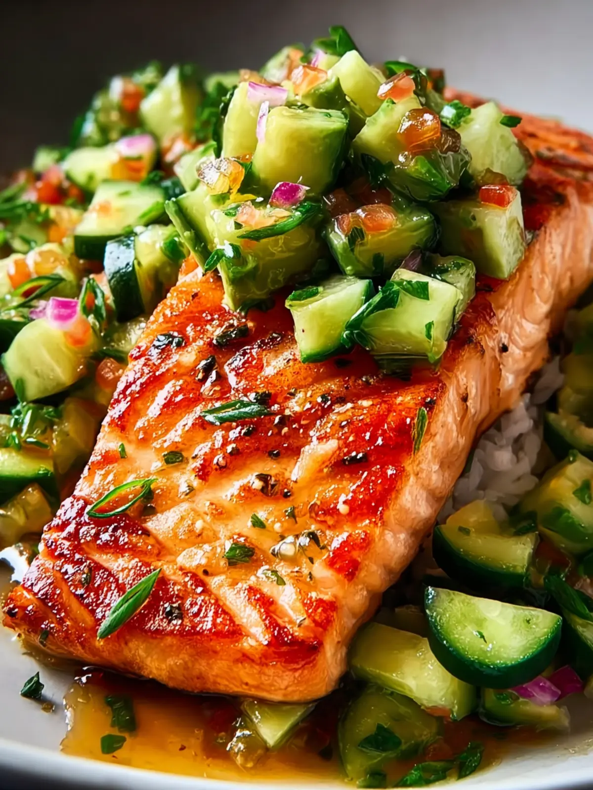 Mango Salsa: Swap out the cucumber for diced mango to bring a fruity punch to the table. The sweetness of mango elevates the dish with a refreshing juxtaposition to the savory salmon.