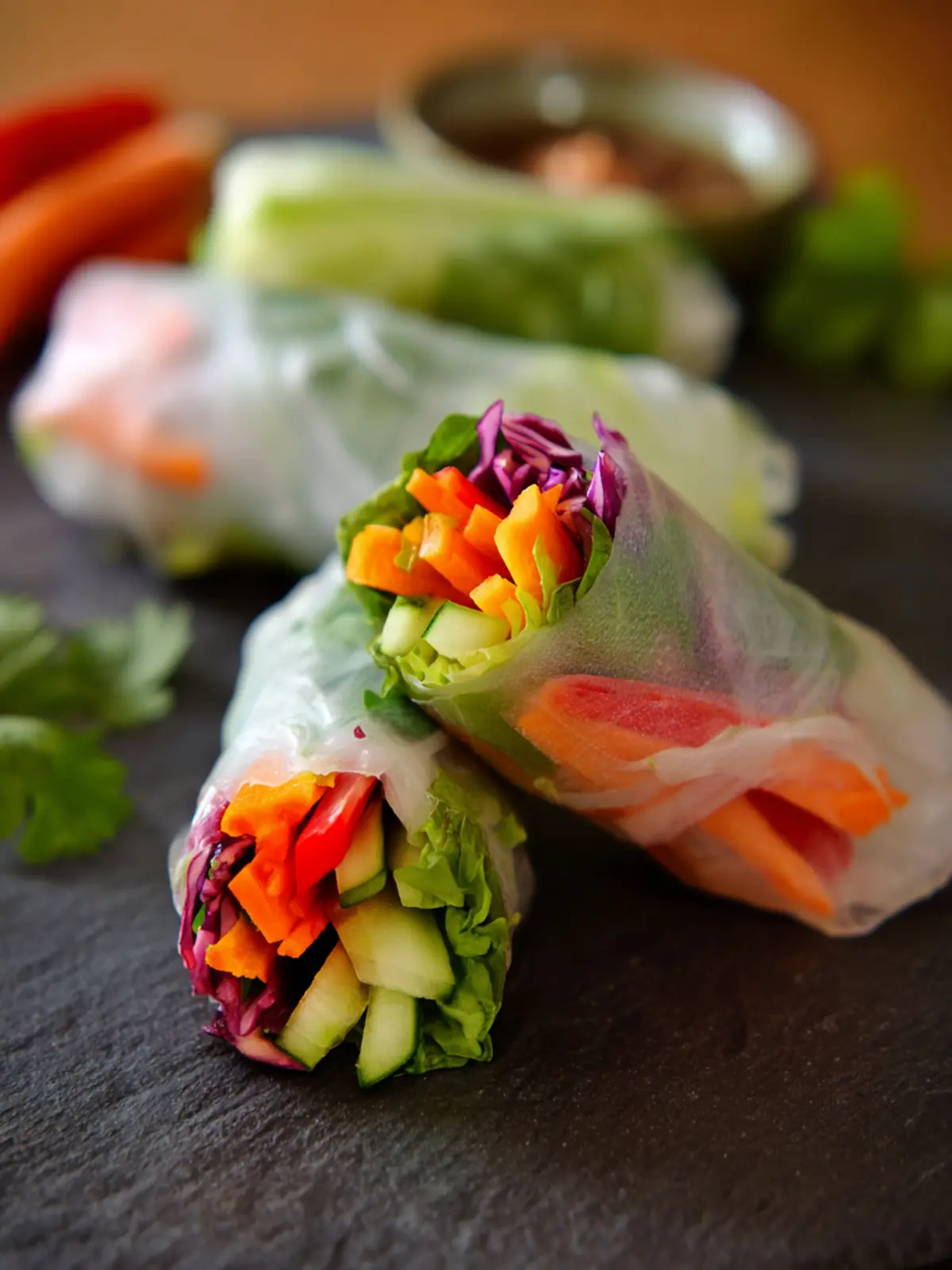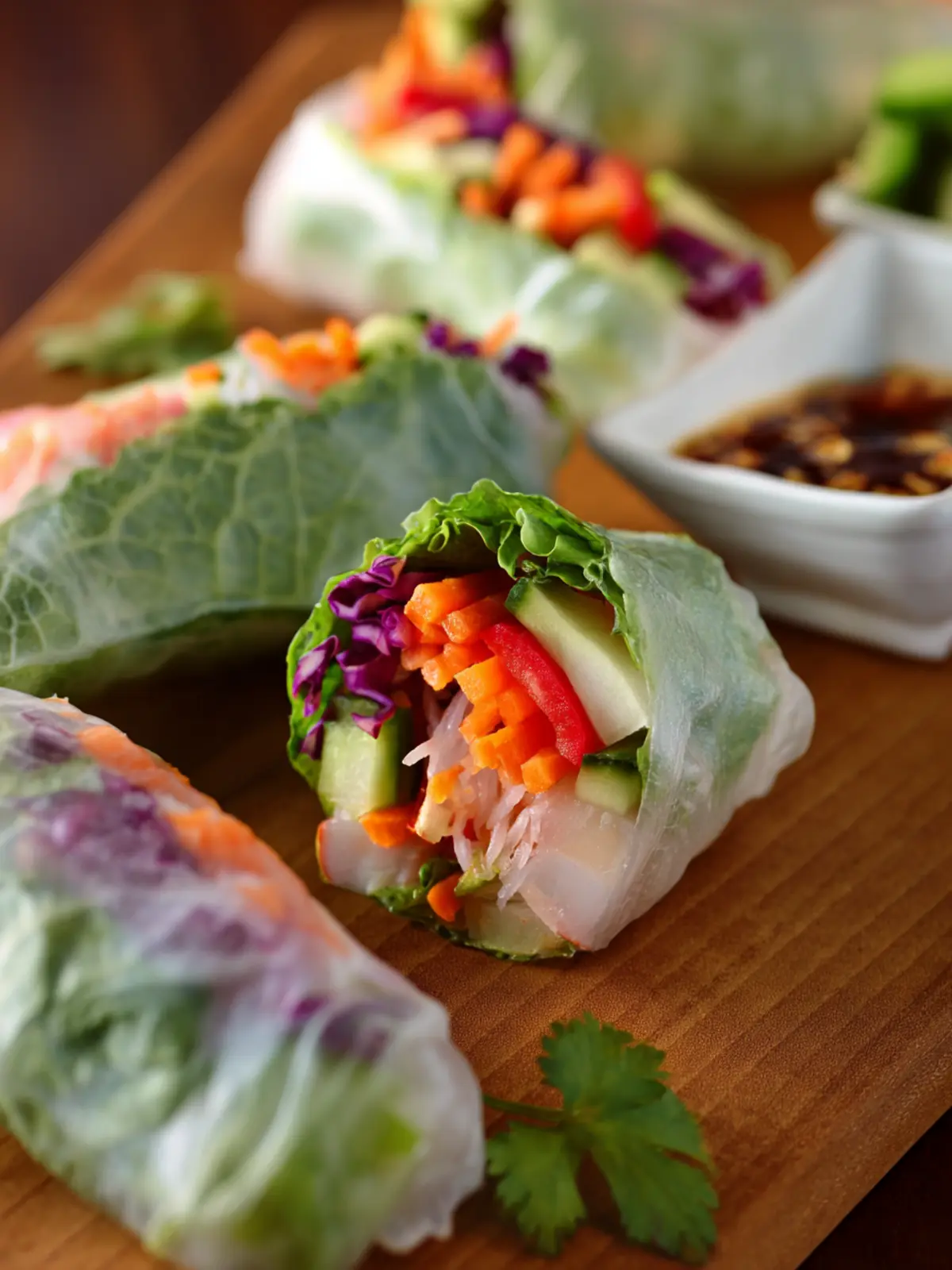 Fresh and healthy veggie spring rolls filled with vibrant vegetables and served with dipping sauces.