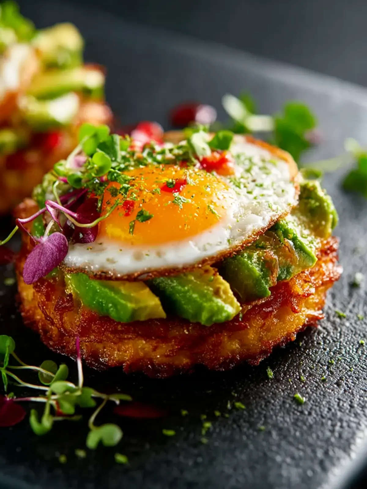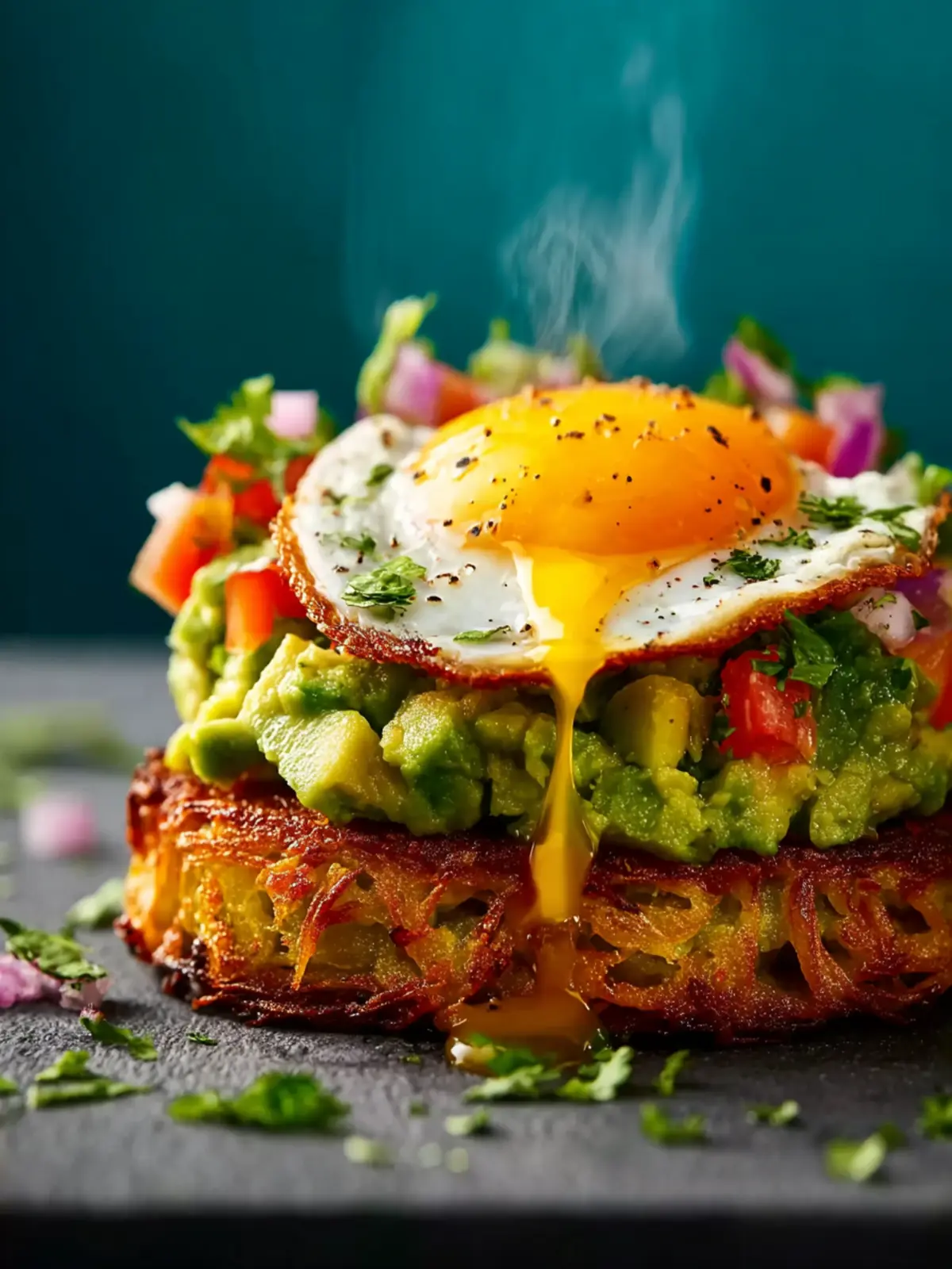 • Texture Contrast: The crispiness of the hash browns juxtaposed with the smooth texture of the avocado creates an irresistible combination that dances in your mouth.