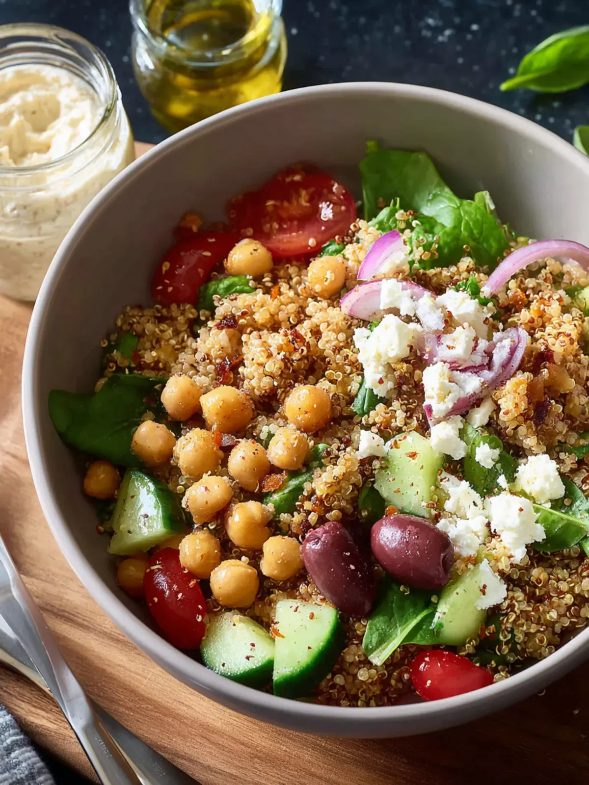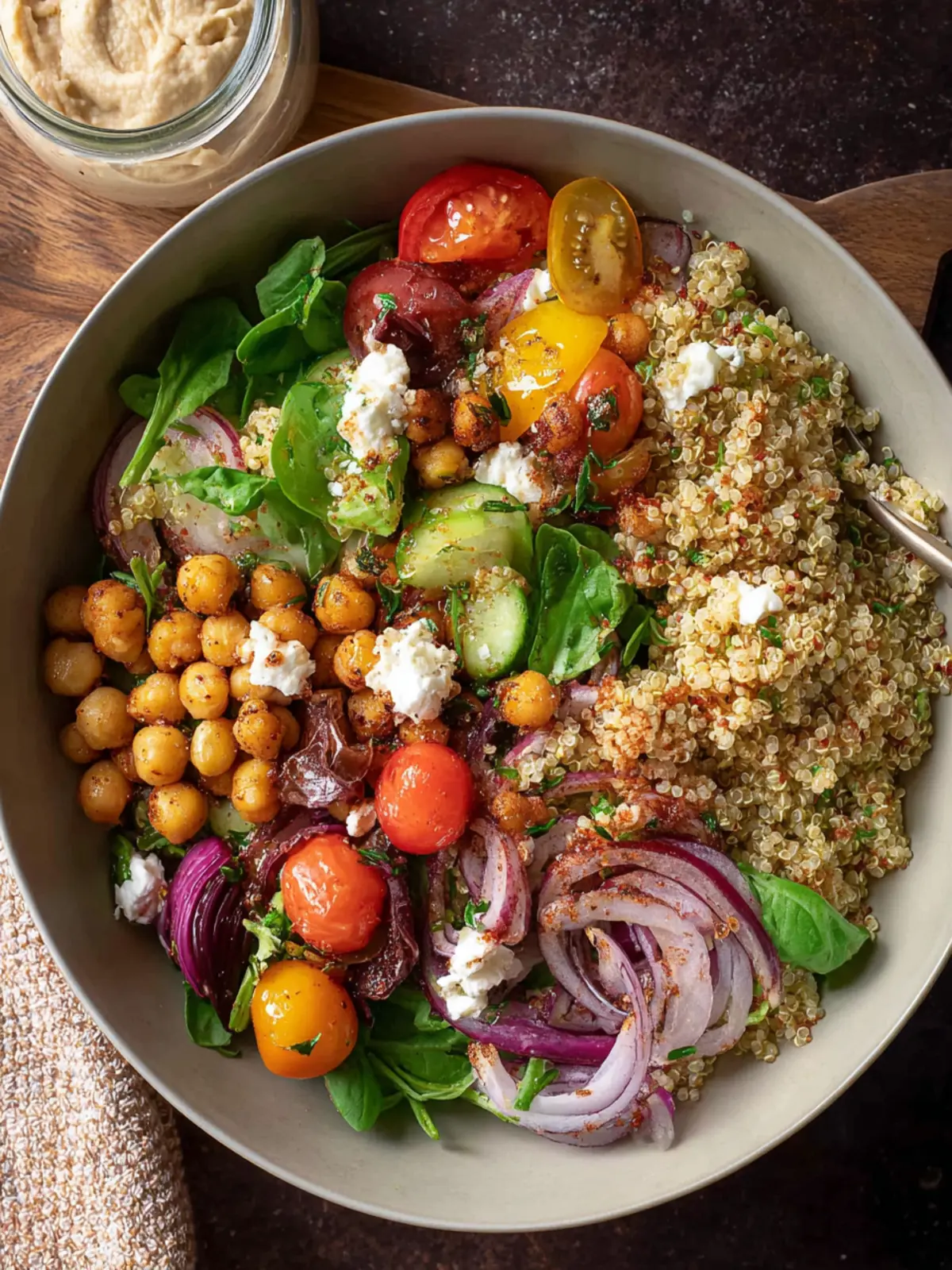 For a wholesome base in your Mediterranean Bowl with Quinoa, I recommend using tri-color quinoa. This type not only offers beautiful color but also brings a slightly nutty flavor and a wonderful texture. Cooking quinoa is simple; just remember to rinse thoroughly to remove any bitterness before cooking!