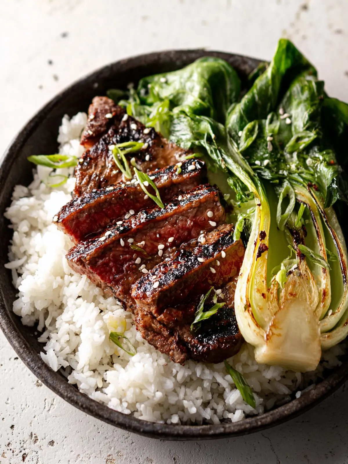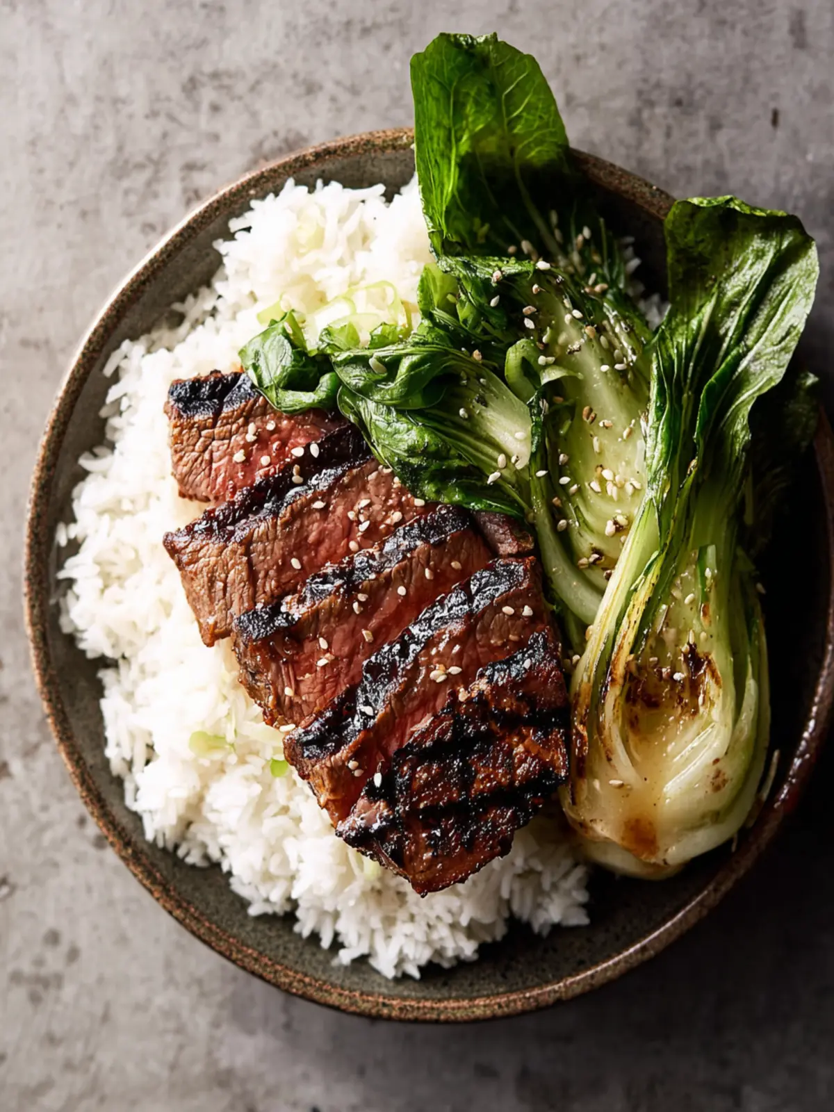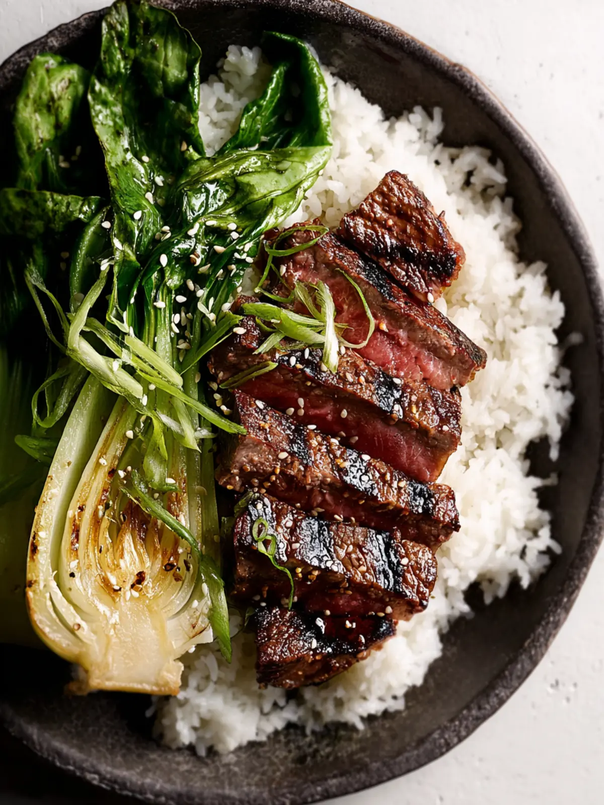 - Divide rice among serving bowls. Top with slices of steak and bok choy and finish with sesame seeds.