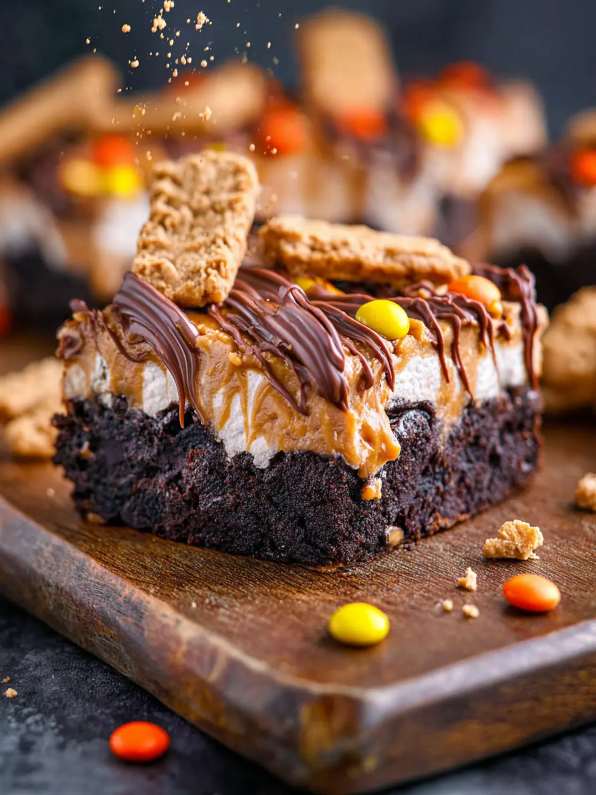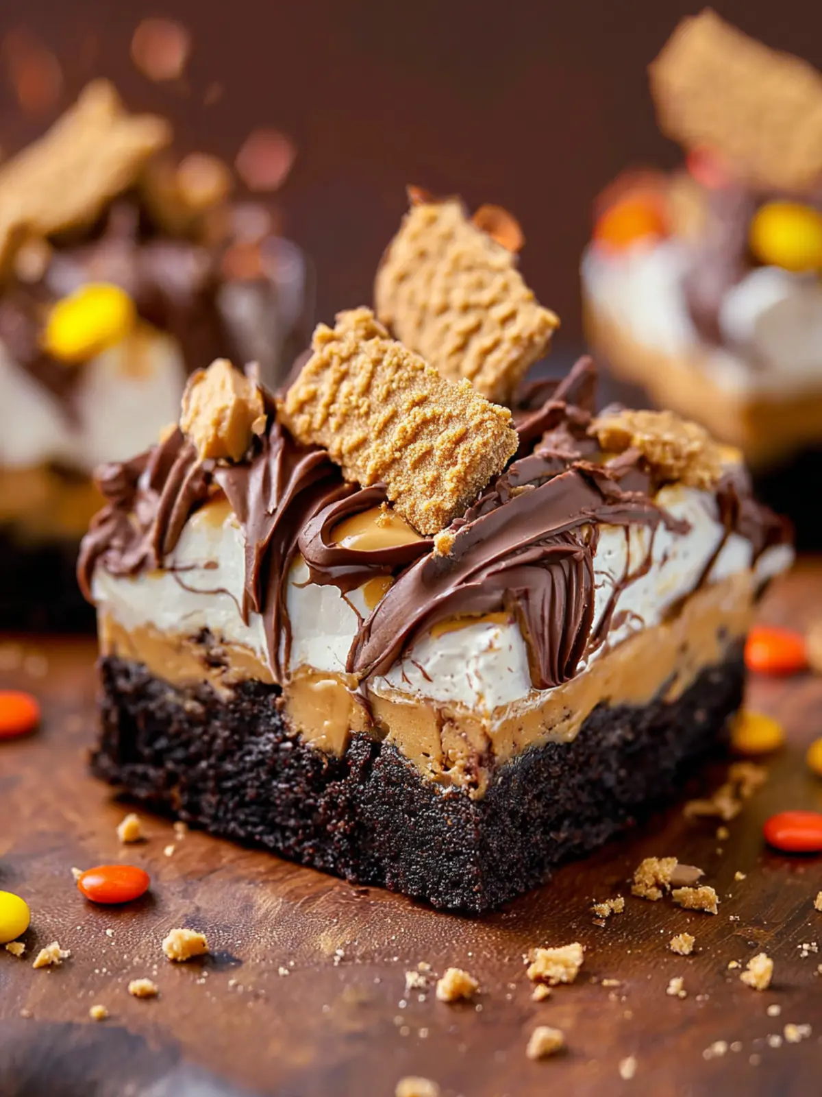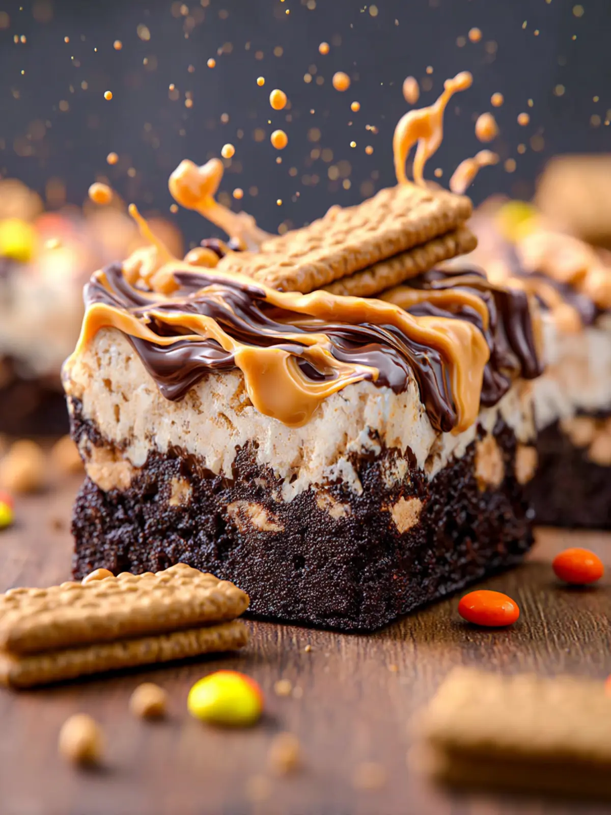 A delicious blend of brownies, peanut butter, and cookies topped with a creamy drizzle.