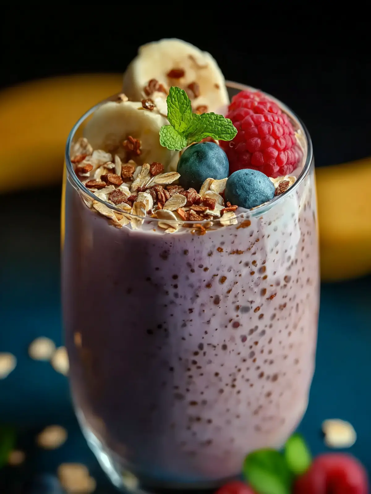 A delicious and nutritious smoothie made with rolled oats, banana, almond milk, and berries.