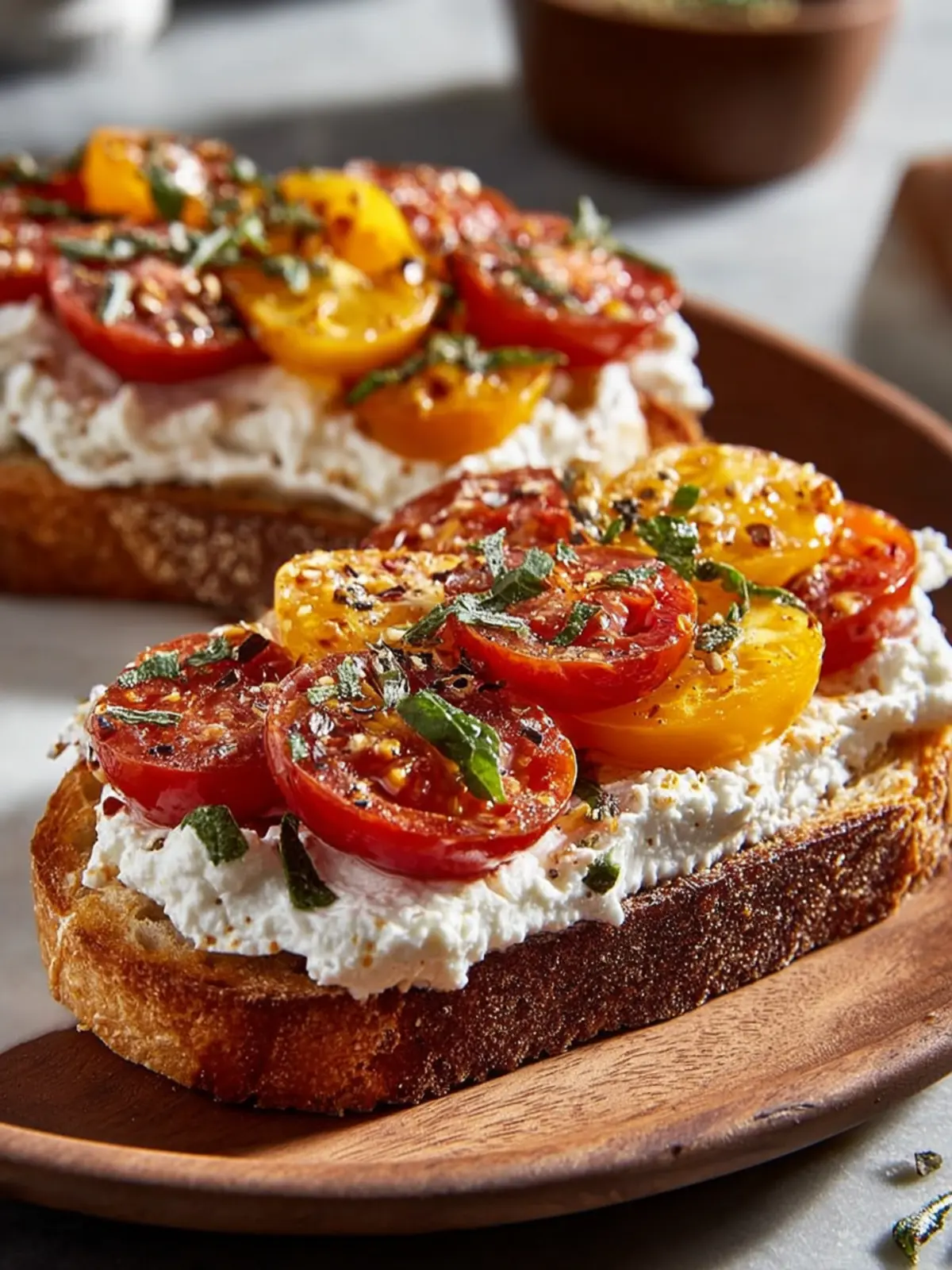 If you love a bit of spice, sprinkle some red pepper flakes or drizzle a little sriracha on top of your savory ricotta and tomato toast. This fiery addition creates a dynamic contrast to the creamy ricotta and juicy tomatoes.