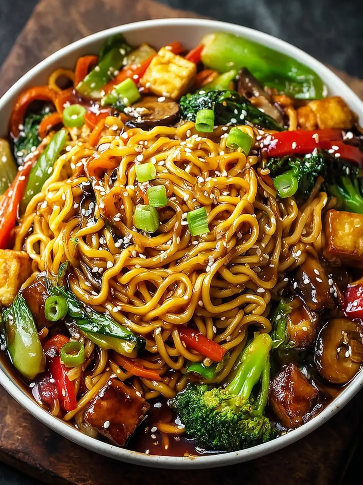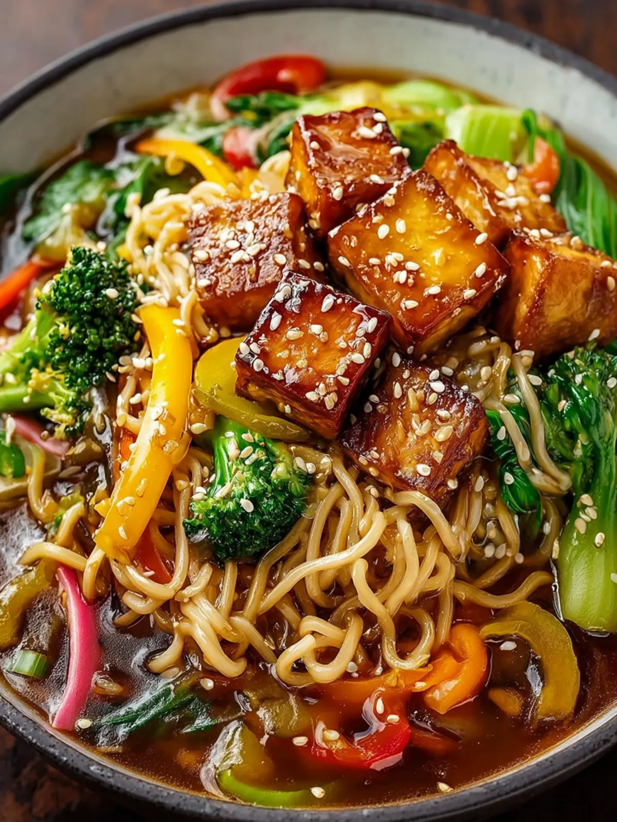 A delicious vegetarian stir-fry featuring golden brown tofu cubes, fresh vegetables, and chewy noodles, all coated in a rich teriyaki sauce.